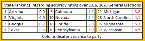 As can be noted, Arizona and Virgina were downright accurate. Georgia, New York and Washington near perfect, each with a very slight variance benefitting one party.
